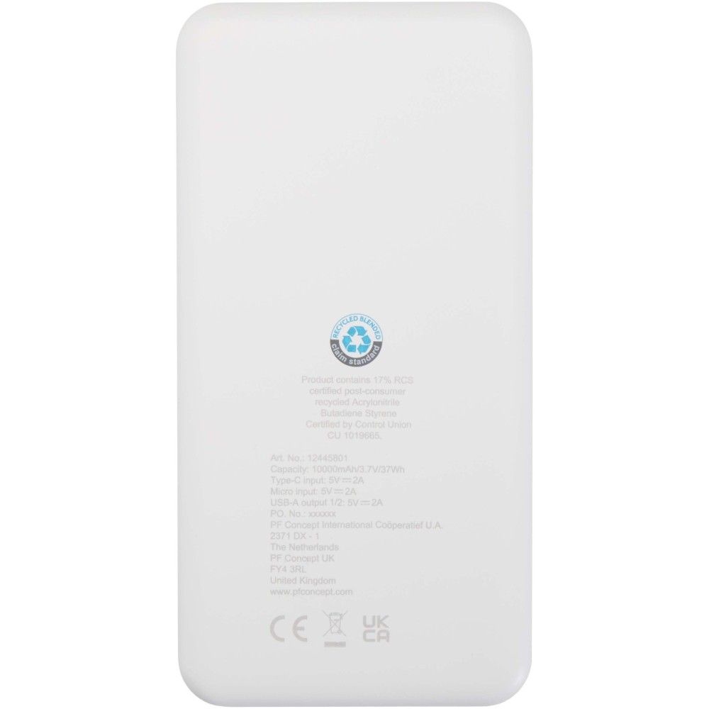 Az Intan 10.000 mAh-s powerbank újrahasznosított műanyagból készül, megbízható energiát biztosítva egész napra. Két USB-A kimeneti porttal, egy Type-C bemenet/kimenettel és egy micro-USB bemenettel rendelkezik, így sokoldalú töltési lehetőségeket kínál. Karcsú kialakítása modern megjelenést ad, az integrált LED-jelző pedig egyértelműen mutatja a töltési állapotot. Emblémázás: UV nyomtatás
