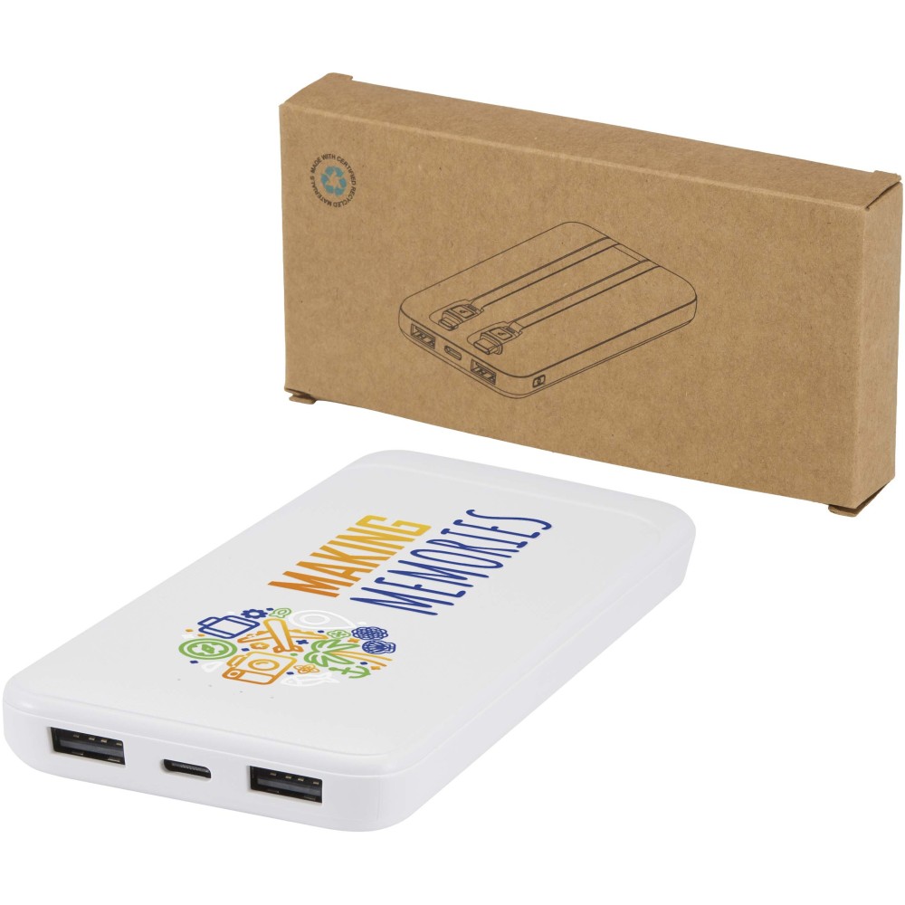 Adhil 10.000 mAh powerbank: Az Adhil 10.000 mAh-s powerbank újrahasznosított műanyagból készül, kompakt kialakítása egyszerre stílusos és praktikus. Két beépített kábellel rendelkezik: egy Type-C, valamint egy Lightning/microUSB kombinált csatlakozóval, továbbá két USB-A kimenettel és egy Type-C bemenet/kimenettel, így sokoldalú töltési lehetőségeket kínál. Az LED-jelző mutatja a töltési állapotot, így útközben is megbízható energiaforrás. Emblémázás: Tamponnyomás, UV nyomtatás