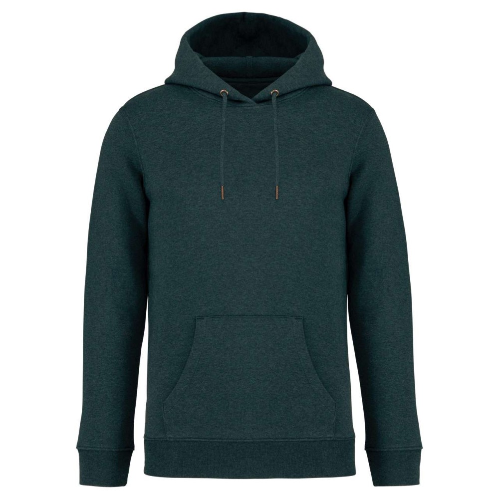 85 % bio, fésült pamutból és 15 % újrahasznosított poliészterből készült. Unisex. Egyenes szabás. Méretcímke organikus pamut és újrahasznosított poliészter logóval. LSF (Low Shrinkage Fleece: előzsugorított polár) kezelés. Kapucni. 1x1 bordás szegély és kézelő. Duplatűzés a kézelőn, a szegélyen és a nyaknál. Szalagozott nyakbelső hátul. Bélelt kapucni, a nyaknyíláson nincs felülvarrás, csak egy megkötés, hogy a húzózsinór a felső részen maradjon. Kerek húzózsinór a kapucnin fém véggel. Kenguru zseb. Nincs márkajelzés a nyakrészen, csak egy méretcímke a könnyű dekorálás érdekében. Karton függőcímkével érkezik, amely felsorolja a termék előállításához felhasznált környezetbarát anyagokat. Organikus pamutfonal. OEKO-TEX N CQ1007/7 STANDARD 100 tanúsítvánnyal rendelkezik. IFTH. 350 g/m2. Emblémázás: Hímzés, Szitanyomás