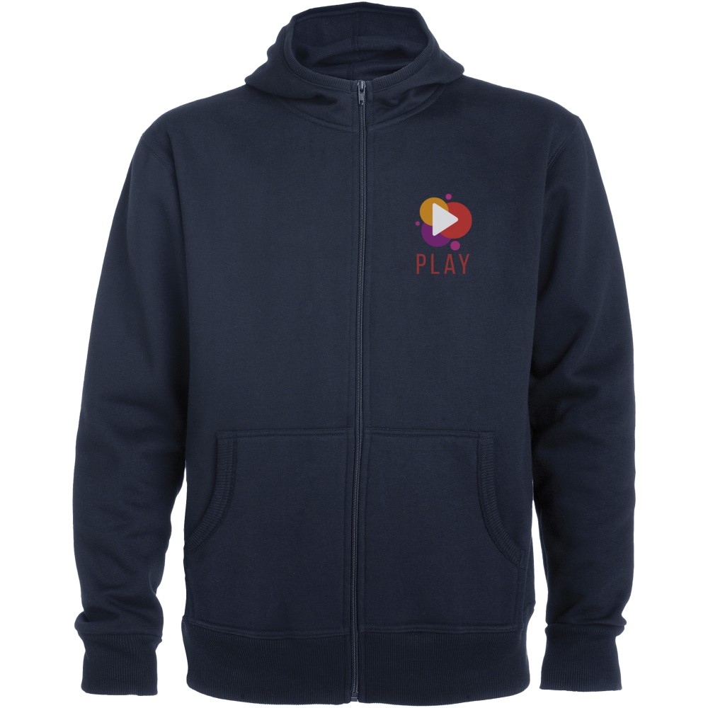 Magasnyakú, kapucnis pulóver teljes cipzárral. Bordázott részletek a kapucni és a zsebek szélén. Kenguru stílusú zseb. 2x2-es bordás kézelő és nyakpasszé. Gyerekméretekben is kapható. 50% pamut és 50% poliészter, 280 g/m2. Emblémázás: Hímzés, Szitanyomás
