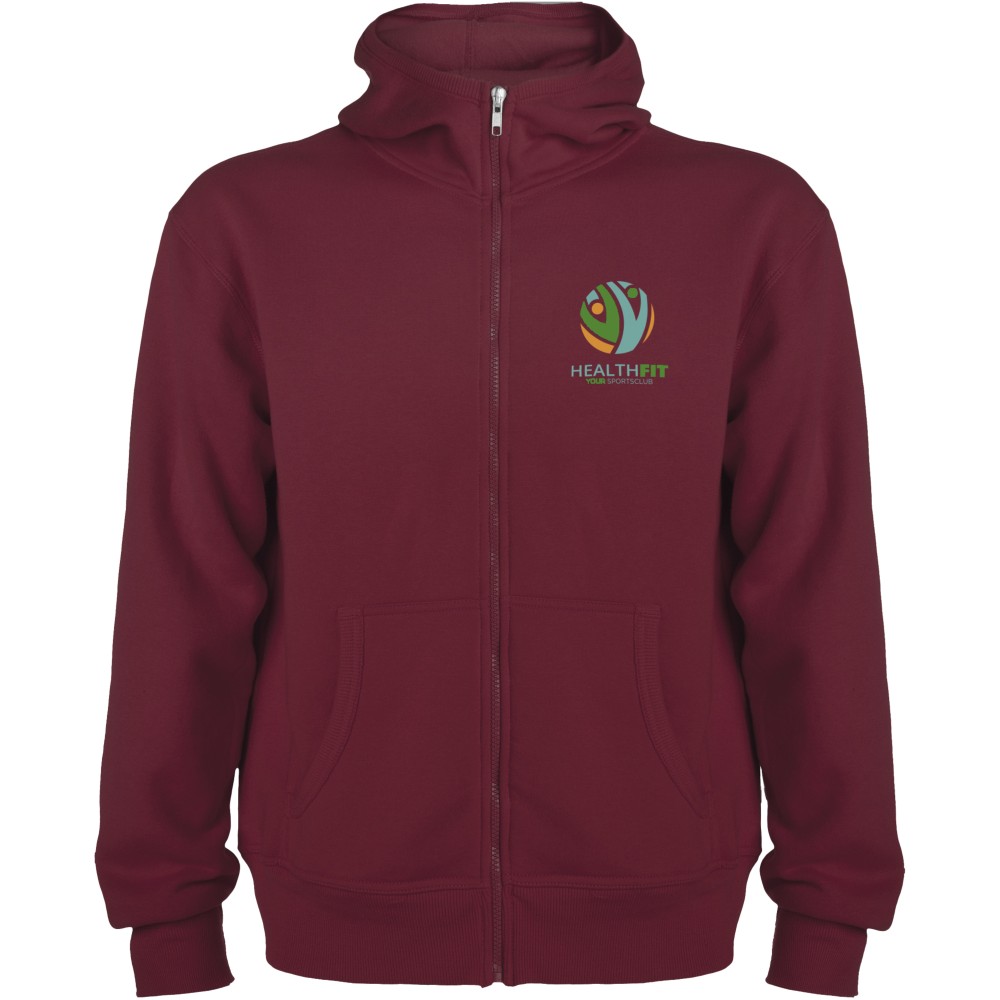 Magasnyakú, kapucnis pulóver teljes cipzárral. Bordázott részletek a kapucni és a zsebek szélén. Kenguru stílusú zseb. 2x2-es bordás kézelő és nyakpasszé. Gyerekméretekben is kapható. 50% pamut és 50% poliészter, 280 g/m2. Emblémázás: Hímzés, Szitanyomás