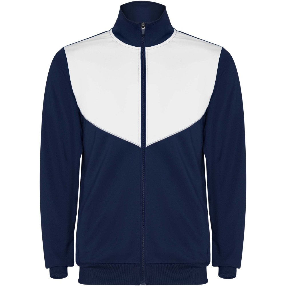 Könnyű és rugalmas anyagból készült melegítő. A végig cipzáros felső kontrasztos színű és varrású díszítésekkel dekorált a mellrészen. Oldalzsebek. Bordázott ujj- és és derékpasszé. Nadrág gumis derékkal és húzózsinórral, kontrasztos oldalsó varrással. Cipzáras szegély. Emblémázás: Hímzés, Szitanyomás