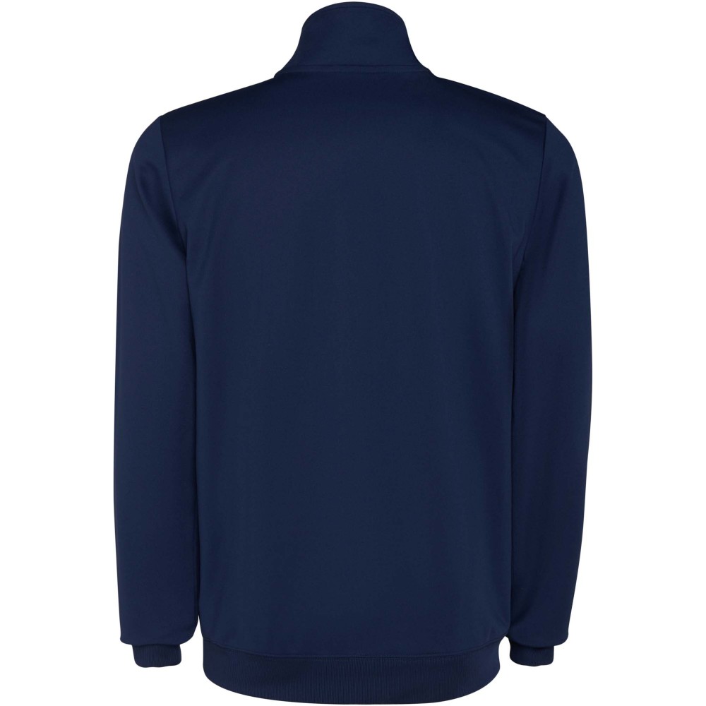 Könnyű és rugalmas anyagból készült melegítő. A végig cipzáros felső kontrasztos színű és varrású díszítésekkel dekorált a mellrészen. Oldalzsebek. Bordázott ujj- és és derékpasszé. Nadrág gumis derékkal és húzózsinórral, kontrasztos oldalsó varrással. Cipzáras szegély. Emblémázás: Hímzés, Szitanyomás