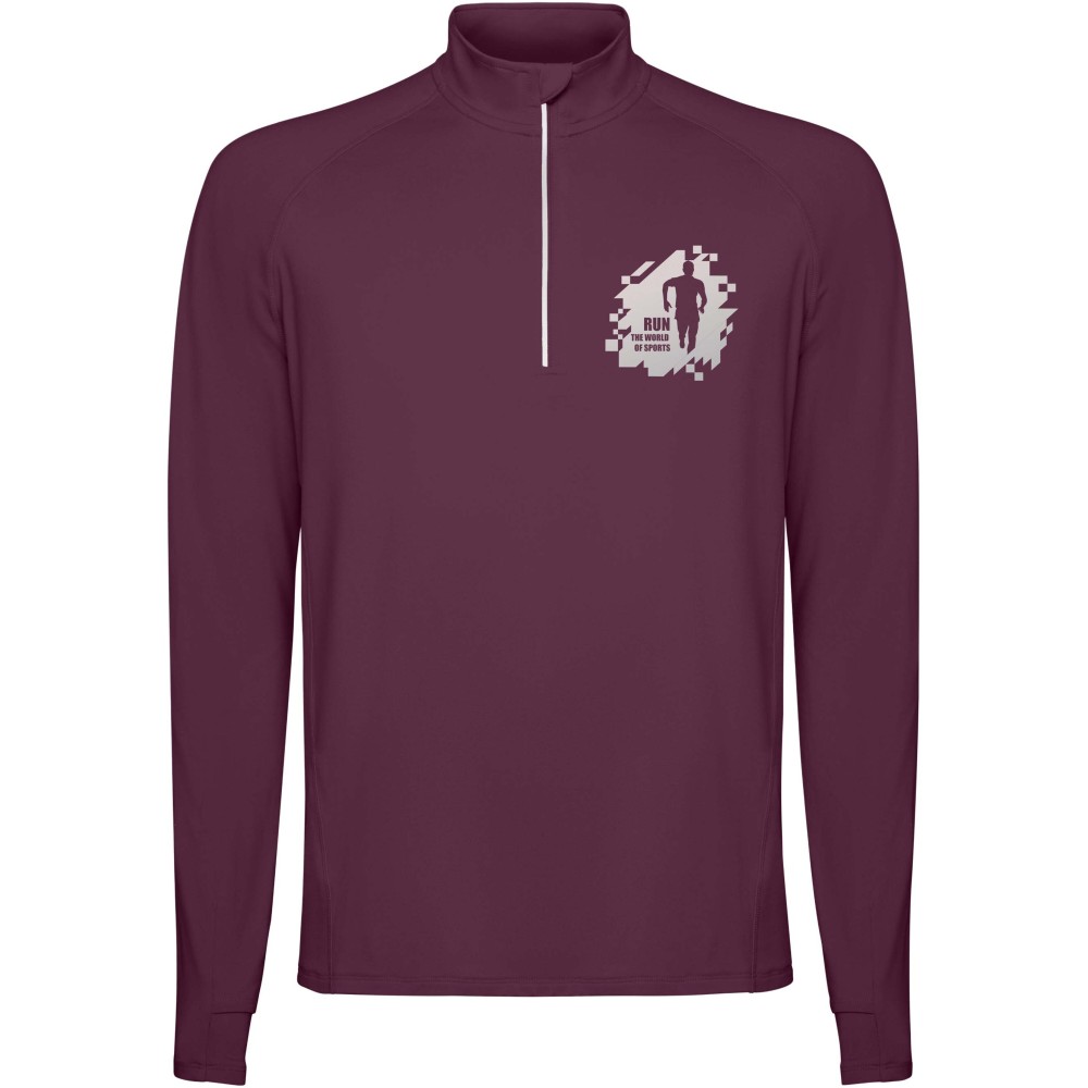 Férfi hosszúujjú technikai raglán pulóver. Gallér fordított félcipzárral, fényvisszaverő részletekkel. Erősített varrások. Mandzsetta hüvelykujj nyílással. Fényvisszaverő részletek a háton. A hátul enyhén hosszabb, mint elől. Meleg, bolyhos belső anyag. Emblémázás: Hímzés, Szitanyomás