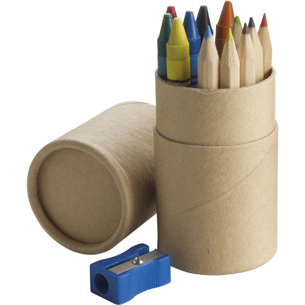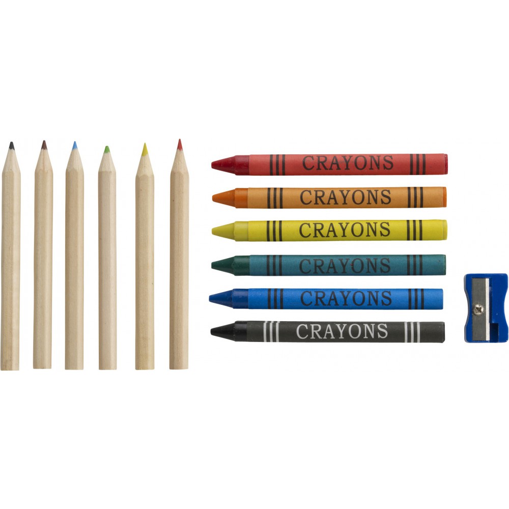 Rajzkészlet. Tartalma: 6 db színesceruza, 6 db zsírkréta, hegyező, kartondobozban. Emblémázás: Tamponnyomás