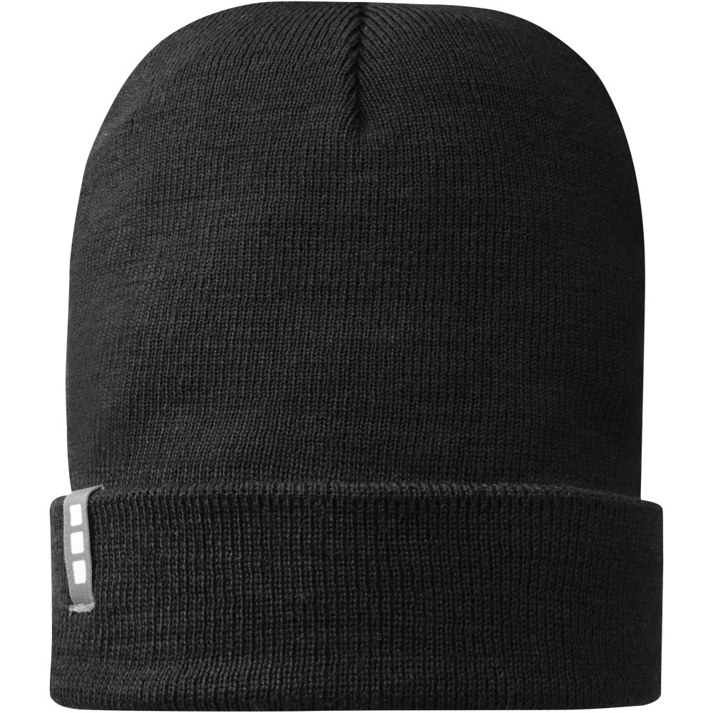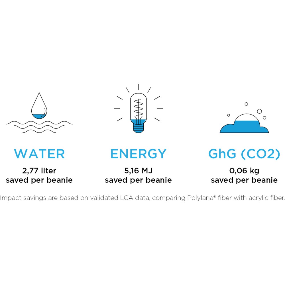 Egyrétegű sapka visszahajtókával, bevarrt márkajelzéssel. A Polylana szál öko alternatívát képez a 100% akril és a gyapjú alapanyagokhoz képest, mert csökkentett víz- és energia-felhasználással készül így csökkentve a CO2-kibocsátást. Emblémázás: Hímzés