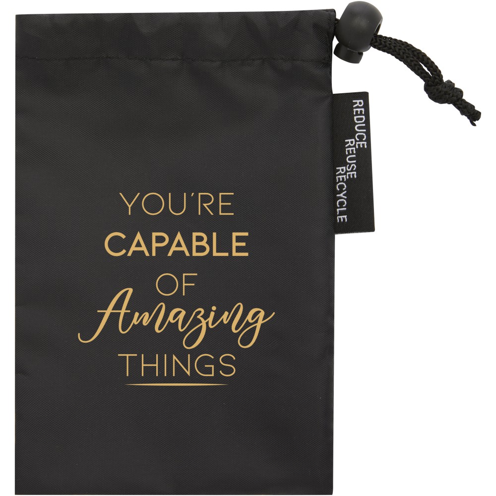 Újrahasznosított poliészterből (RPET) készült jógaszalag. Az RPET használata segít csökkenteni a pazarlást és elősegíti a környezet fenntarthatóságát. Az újrahasznosított műanyagok felhasználásával az új műanyagok keletkezése minimálisra csökken, így fenntarthatóbb választás. Mérete: 181 x 3,8 cm. A tasak is RPET-ből készült. Emblémázás: Szitanyomás