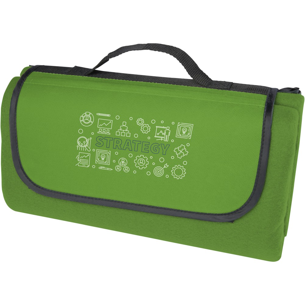 Vízálló, 140 g/m2-es pikniktakaró újrahasznosított PET műanyagból, fenntartható választás. Összecsukva és rögzítve a takaró könnyen tárolható és hordozható a mellékelt fogantyúval. Emblémázás: Szitanyomás