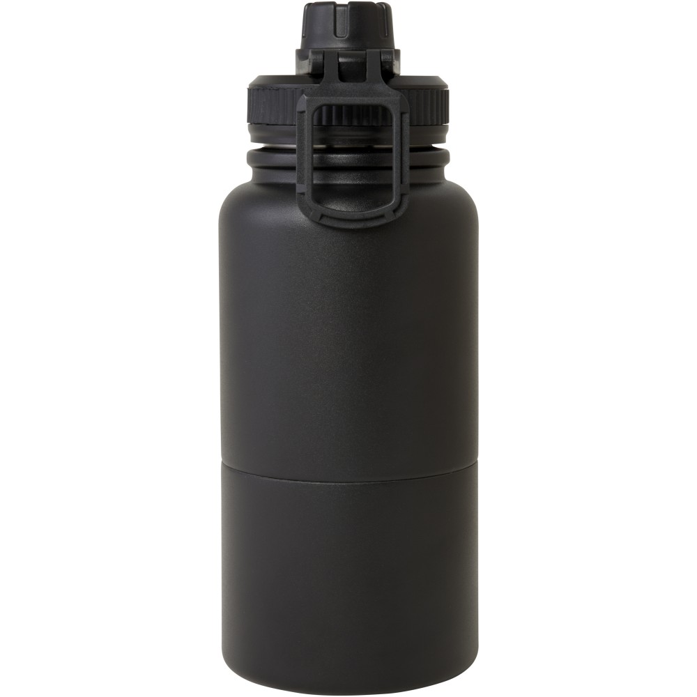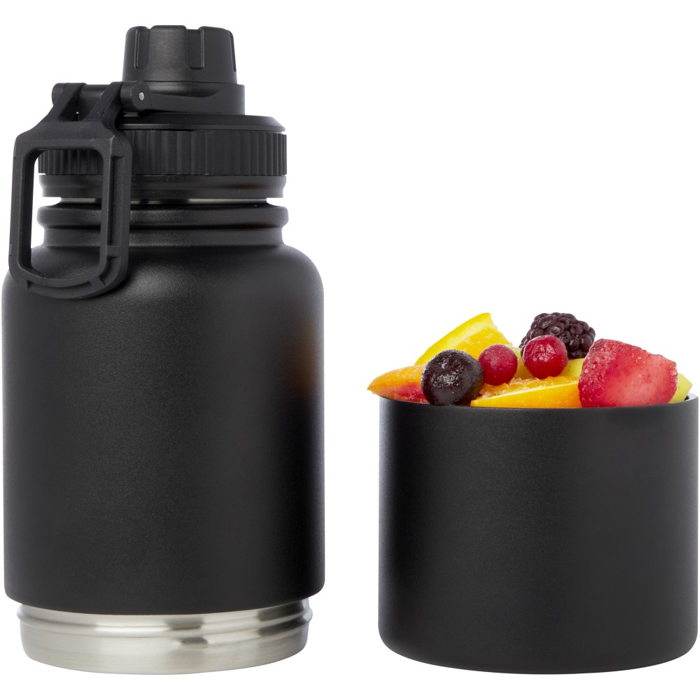 RCS tanúsítvánnyal rendelkező, rozsdamentes acélból készült, szigetelt palack kivehető tárolóedénnyel. A palack felső részén egy rézből készült hőszigetelt termosz található, amelynek űrtartalma 530 ml és több órán keresztül melegen vagy hidegen tartja az italokat. Az alsó rész egy duplafalú tárolóedény, amely akár 340 ml tárolására is alkalmas. Használható pohárként kedvenc hideg italaid, illetve rágcsálnivalók vagy más apróságok tárolására. Újrahasznosított kartonból készült díszdobozban szállítjuk. Emblémázás: Gravírozás
