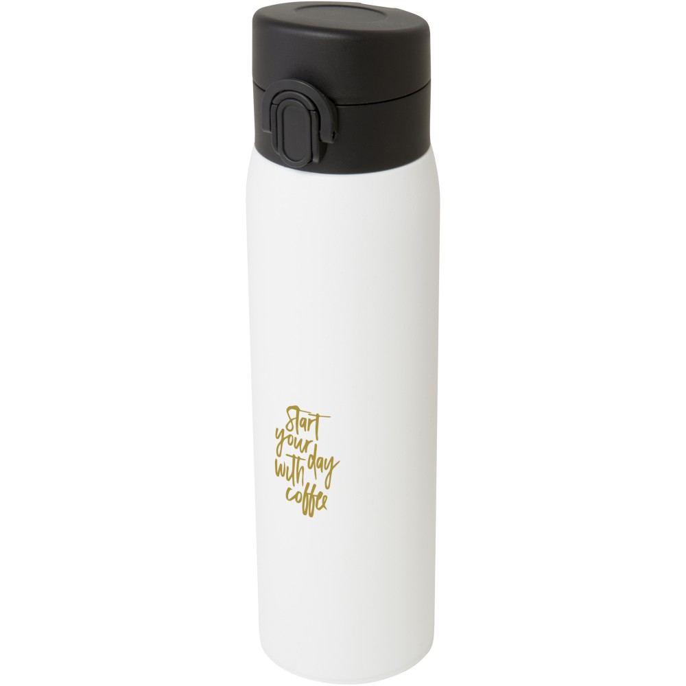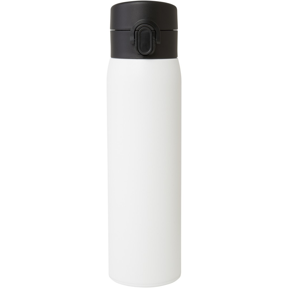 Stílusos, RCS tanúsítvánnyal rendelkező újrahasznosított rozsdamentes acélból készült, szigetelt palack gombos nyitómechanizmussal. A flaska szivárgásmentes és a réz vákuumszigetelésnek köszönhetően az italokat több órán keresztül forrón vagy hidegen tartja. Űrtartalom: 450 ml. Újrahasznosított kartonból készült díszdobozban szállítjuk. Emblémázás: Gravírozás