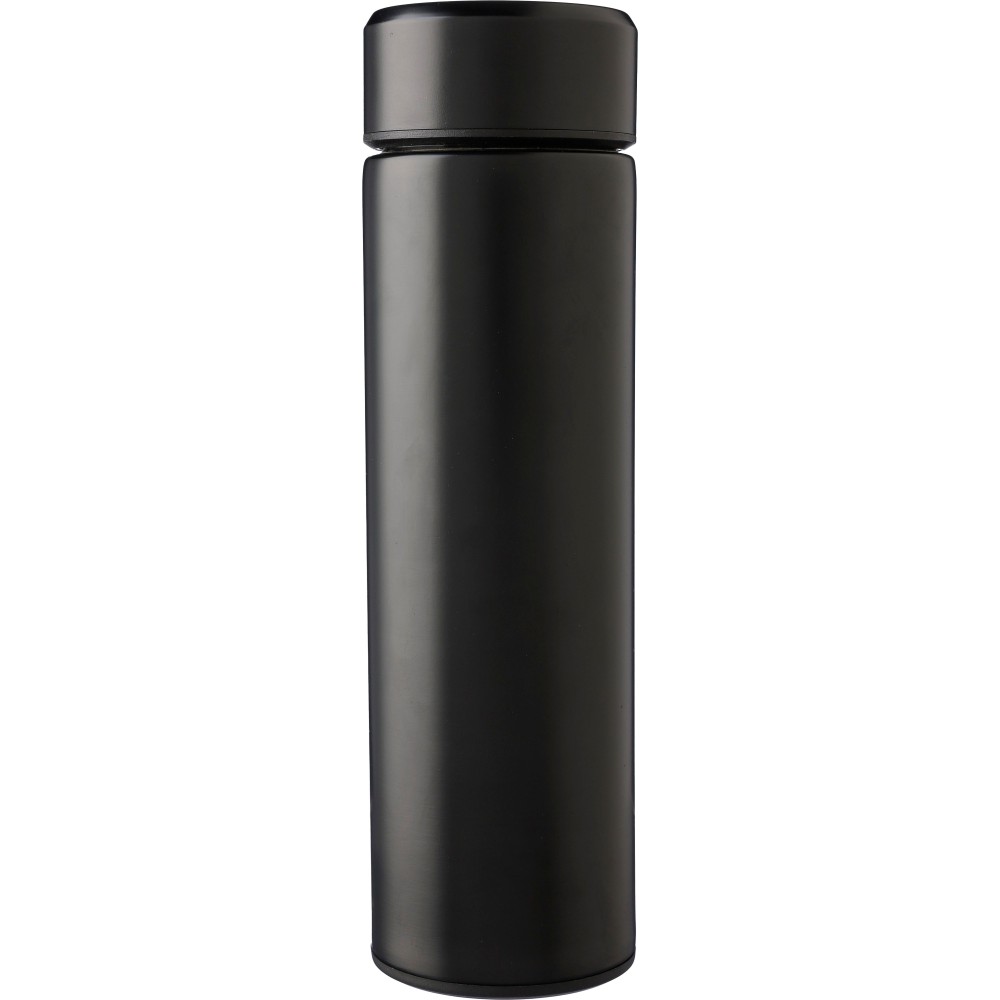 Duplafalú palack beépített, kivehető teaszűrővel. A belső rész 304-es rozsdamentes acélból, a külső rész 201-es rozsdamentes acélból készült. Egyenként barna kartondobozba csomagolva. Űrtartalom: 425 ml. Emblémázás: Gravírozás, Tamponnyomás