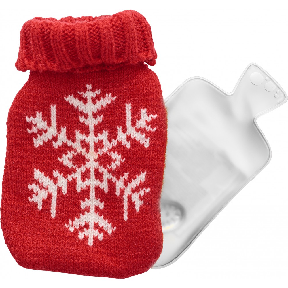 Melegítőtasak hópihe mintás, kötött bevonattal. A fémkorong többszöri megnyomásával aktiválható. Újbóli használat előtt tegyük 6-8 percre forró vízbe, amíg a tasakban lévő folyadék áttetszővé nem válik. PVC. Emblémázás: Tamponnyomás