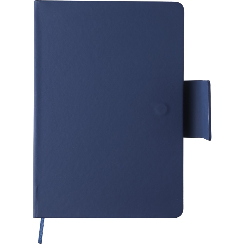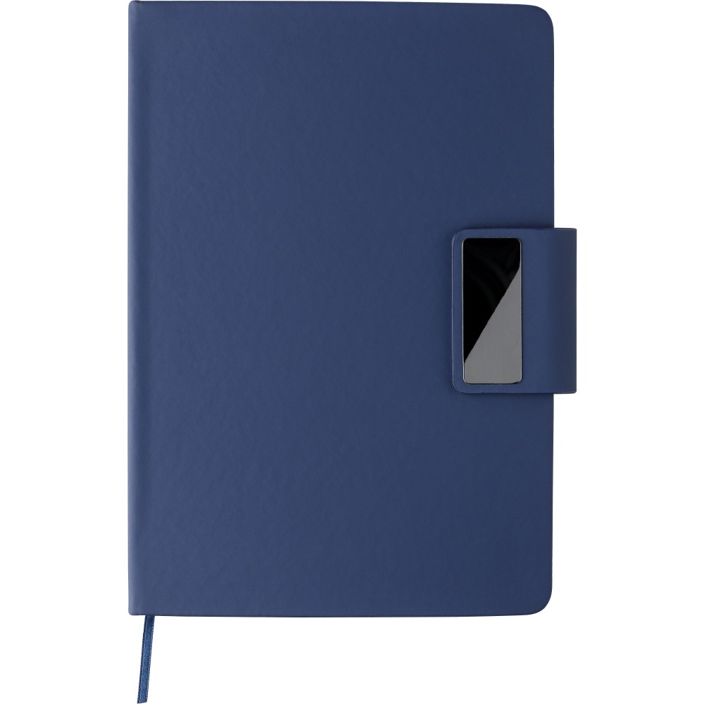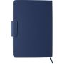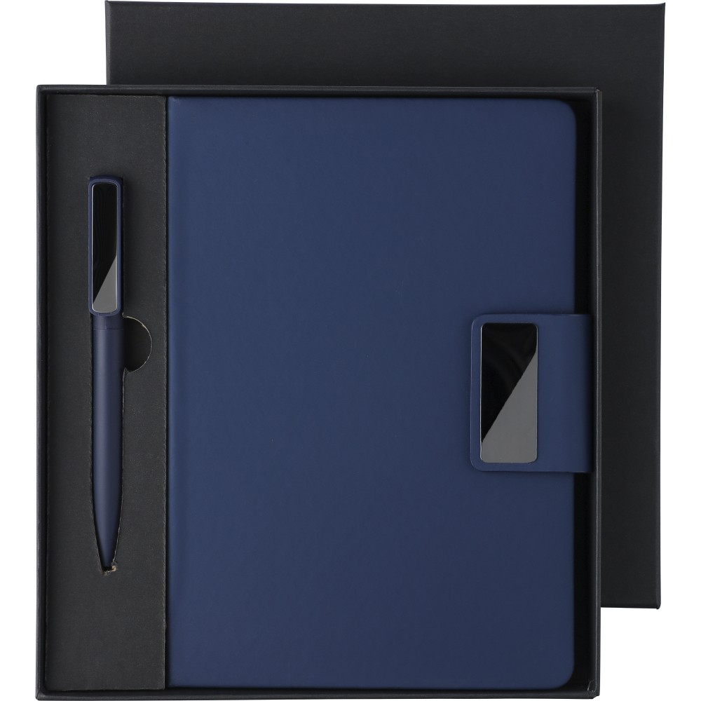 Karton ajándékkészlet. Tartalma: újrahasznosított alumínium csavaros golyóstoll kék tintával és újrahasznosított PU jegyzetfüzet. A jegyzetfüzet 80 lapos 70 g/m2-es vonalas papírral, és szalagos könyvjelzőt és fém mágneses zárat tartalmaz acélszürke gravírozott lappal. Mindkét termék újrahasznosított logóval van ellátva: dombornyomva a jegyzetfüzeten és gravírozva a tollon. Emblémázás: Gravírozás, Szitanyomás