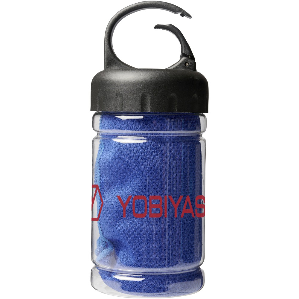 Hűtőtörölköző PET tartóban. A törököző mérete: 30 x 80 cm. 100% poliészter. Emblémázás: Tamponnyomás