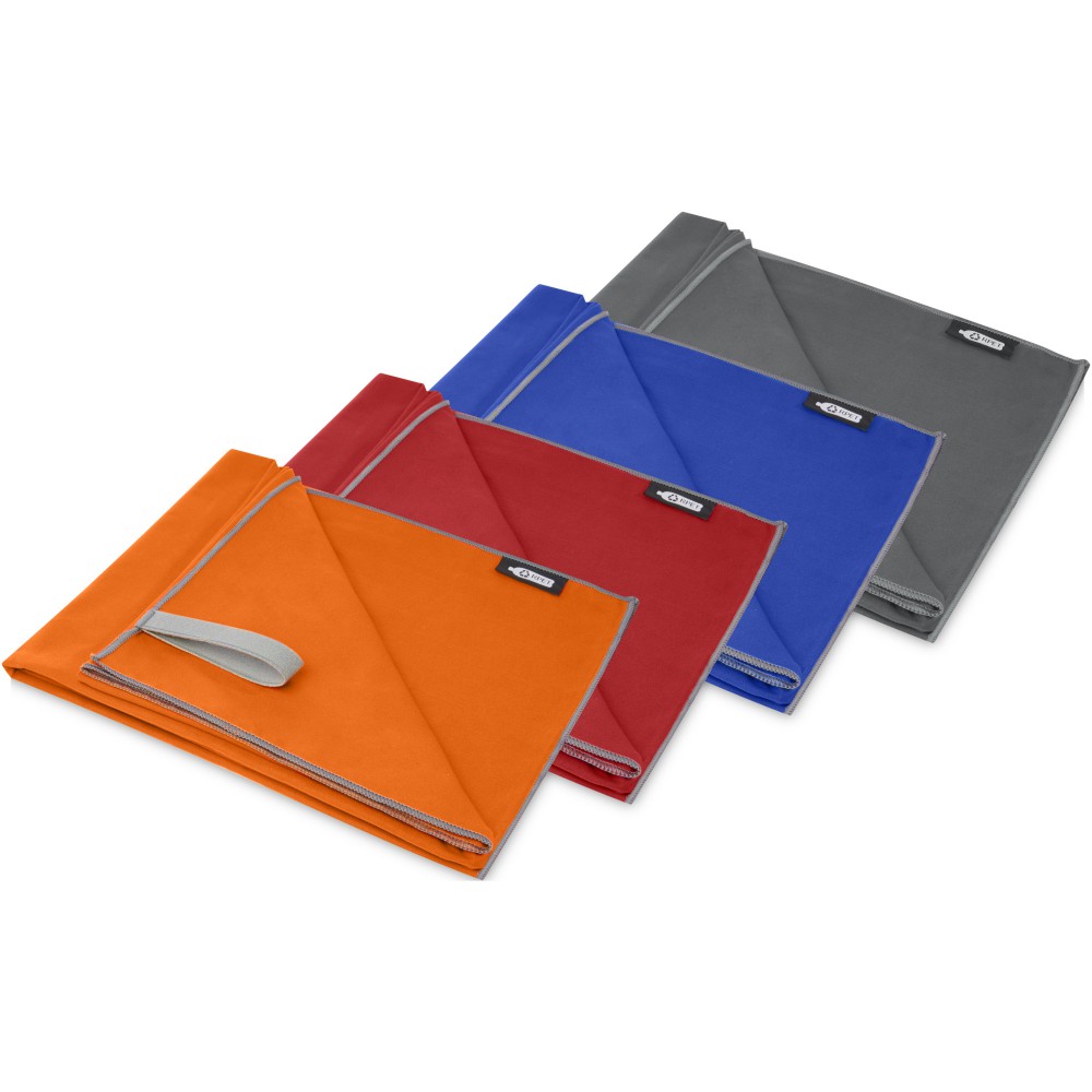 Ez a sporttörölköző nagyon jó nedvszívó, könnyű és gyorsan szárad. Ha a törölközőt összehajtjuk és gumiszalaggal rögzítjük, kis mérete miatt alkalmas edzőterembe, uszodába, vagy kempingezésre. A törölköző 130 x 80 cm méretű, 200 gr/m2-es újrahasznosított PET poliamidból készült, mosógépben 40°C-on mosható. Újrahasznosított PET műanyagból készült tároló tasakkal (20 x 8,5 cm) szállítjuk, amely remek helyet biztosít a logó nyomtatásához. Emblémázás: Hímzés, Szitanyomás