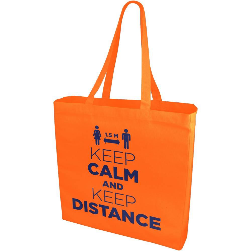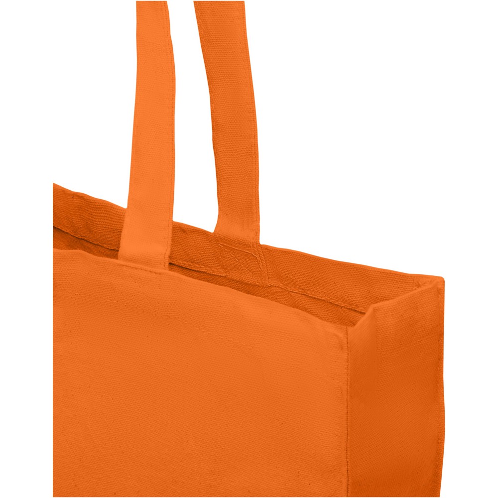 Nyitott tetejű táska háromszög alakú oldalbetéttel. A lehajtható fülek magassága 31 cm. Emblémázás: Szitanyomás