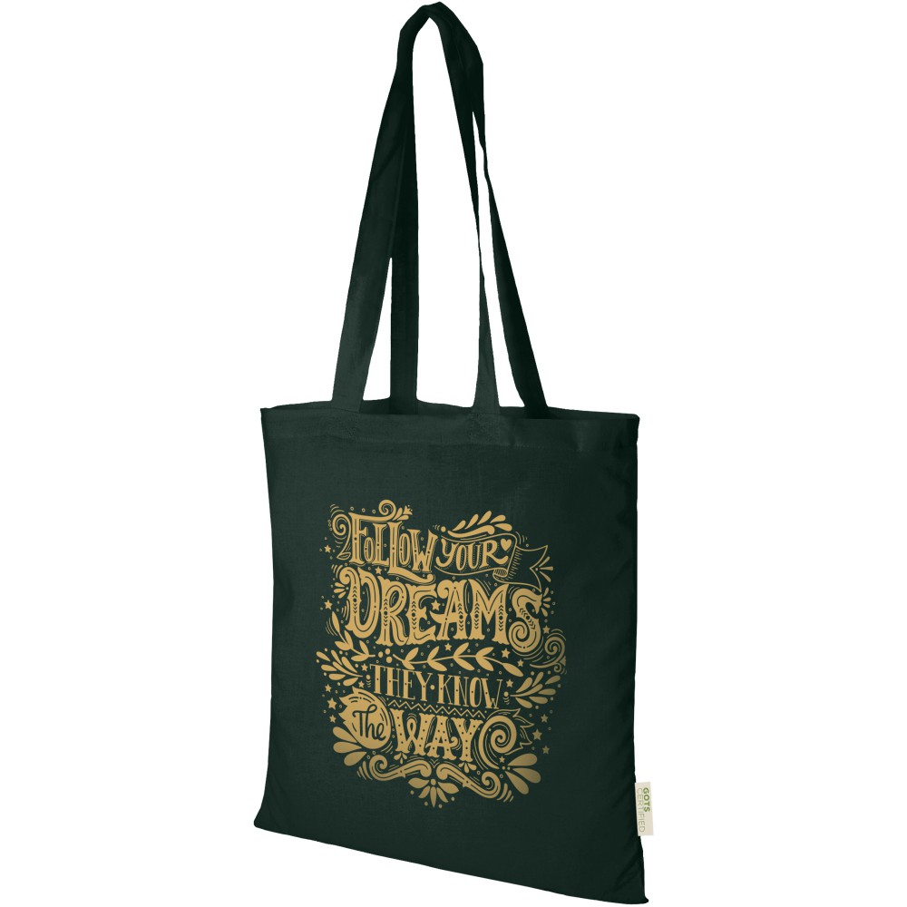 Tanúsított pamuttáska, amely bármilyen rendezvényen, konferencián ajándékozható, majd kisebb élelmiszerek bevásárlótáskájaként használhatja. A 140 g/m2-es pamutsűrűségnek köszönhetően a táska erős, hosszú élettartamú és alkalmas nehéz tárgyak szállítására a nagy fő rekeszben. 32 cm hosszú fogantyúval rendelkezik, így vállon is vihető. Emblémázás: Szitanyomás