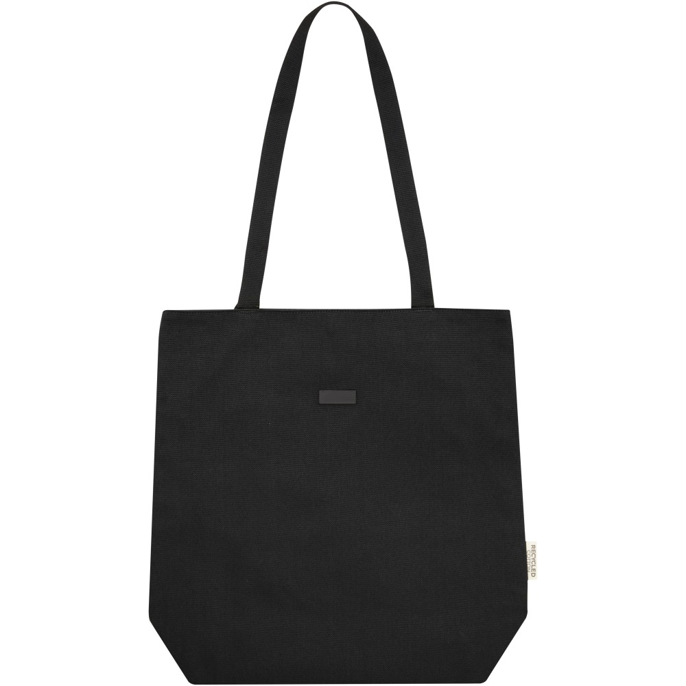 A táska GRS tanúsítvánnyal rendelkező újrahasznosított vászonból és GRS tanúsítvánnyal rendelkező RPET béléssel készült. Ez a sokoldalú táska egy bélelt, 15 -os laptoprekesszel és két belső tartóval rendelkezik a telefon, a pénztárca vagy a kiegészítők számára, valamint könnyű gombos záródással és kényelmes pamut fogantyúkkal. Fémlapja gravírozható. Emblémázás: Szitanyomás