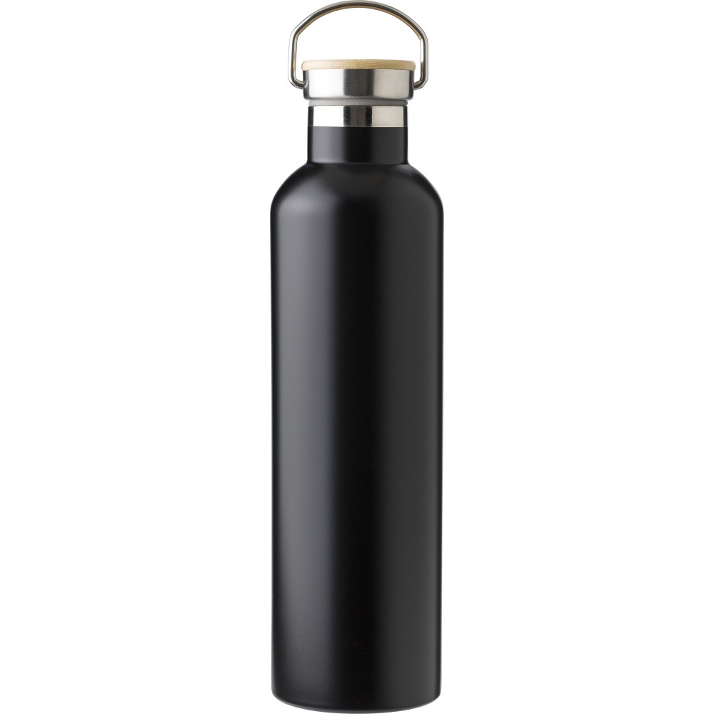Duplafalú palack bambusz betéttel a kupakon. Rozsdamentes acél. Nagy űrtartalmú palack: 1L. Emblémázás: Gravírozás, Tamponnyomás