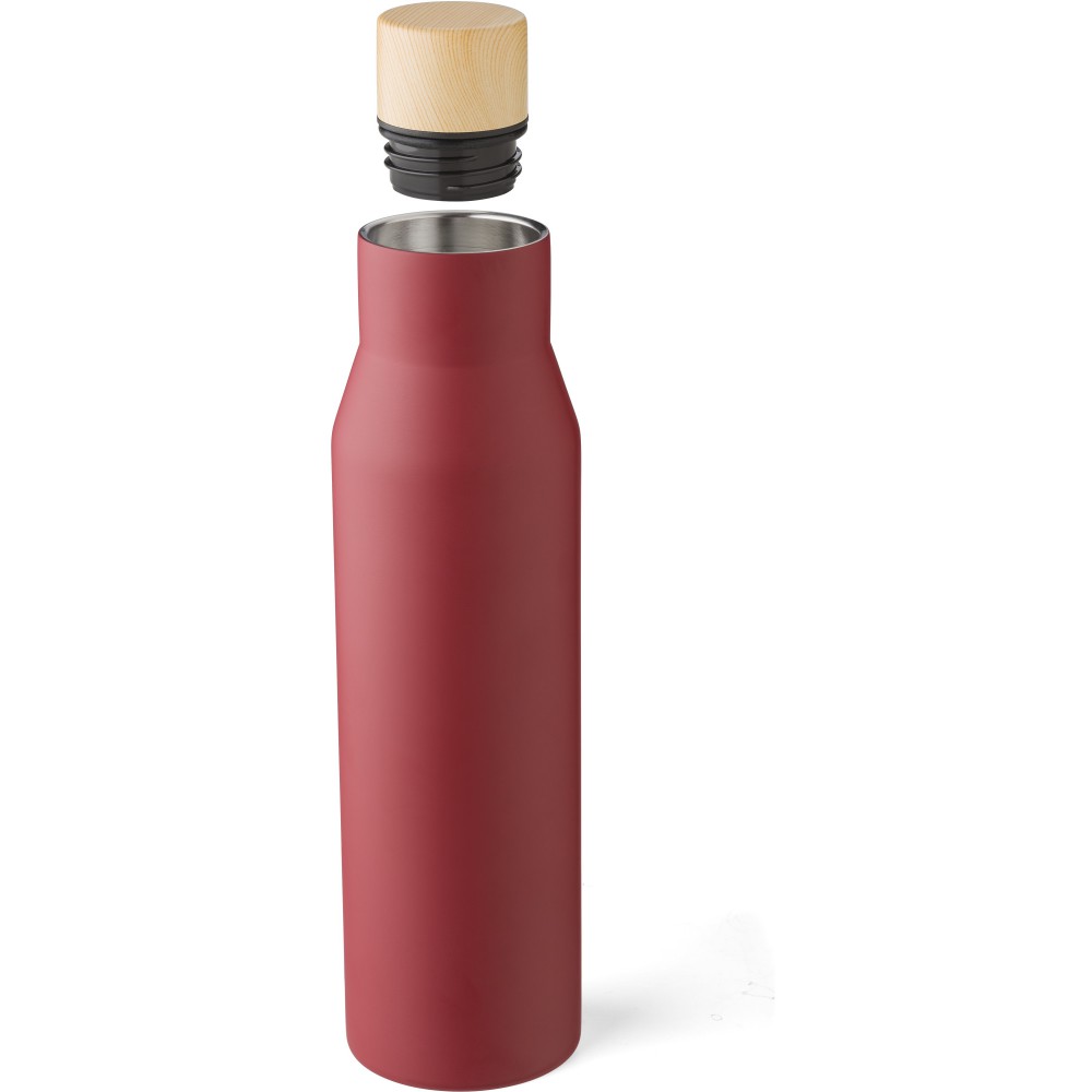 Rozsdamentes acél (s/s304), duplafalú palack fa tetővel. Barna kartondobozba egyedileg csomagolva. Űrtartalom: 500 ml. Emblémázás: Bögredekor, Gravírozás, Körszita