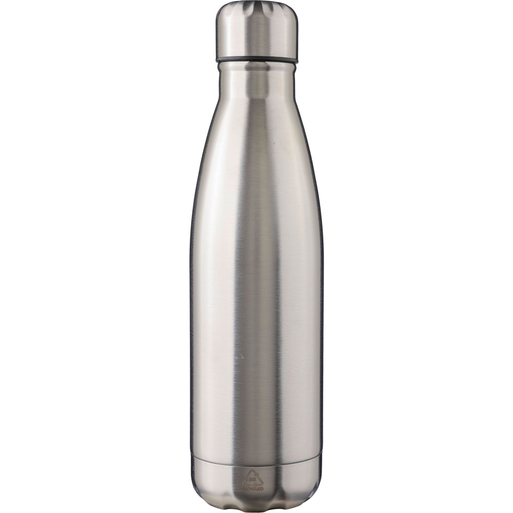 Újrahasznosított rozsdamentes acél, egyrétegű kulacs csavaros kupakkal. 304-es rozsdamentes acélból készült. Az újrahasznosított logó gravírozva van a kulacson. Egyenként barna kartondobozba csomagolva. Űrtartalom: 650 ml. Emblémázás: Bögredekor, Gravírozás
