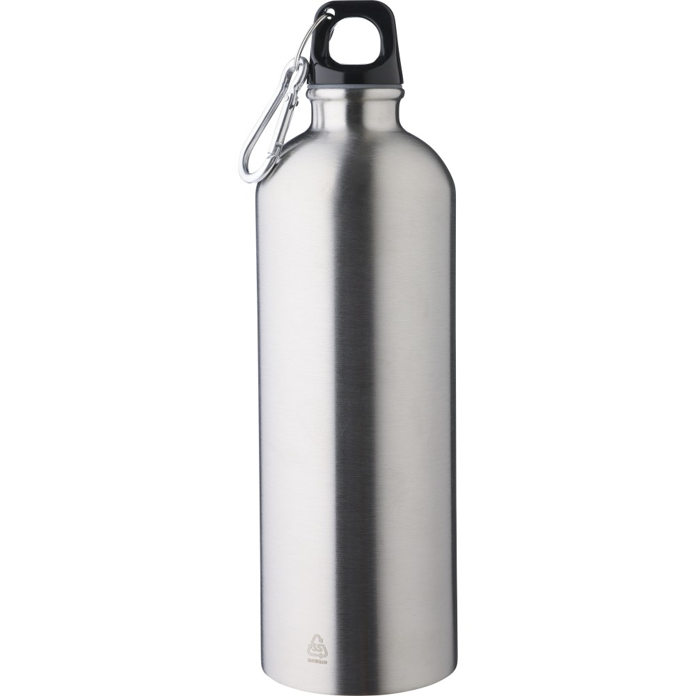 Újrahasznosított rozsdamentes acélból készült 750 ml-es szimplafalú kulacs PP kupakkal és alumínium karabinerrel. Az újrahasznosított anyagra utaló logó a palackra van gravírozva. Mosogatógépben nem tisztítható. Emblémázás: Bögredekor, Gravírozás, Körszita