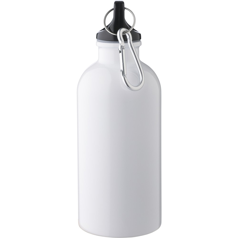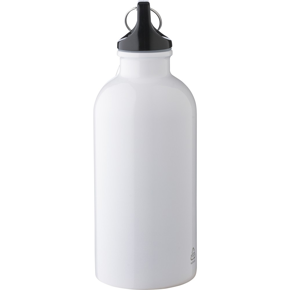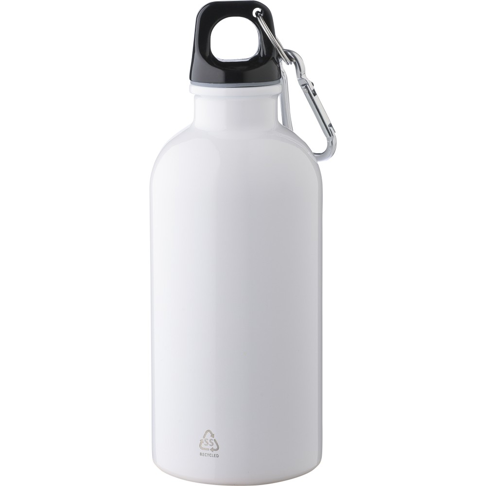 Újrahasznosított rozsdamentes acélból készült 400 ml-es szimplafalú kulacs PP kupakkal és alumínium karabinerrel. Az újrahasznosított anyagra utaló logó a palackra van gravírozva. Mosogatógépben nem tisztítható. Emblémázás: Bögredekor, Gravírozás