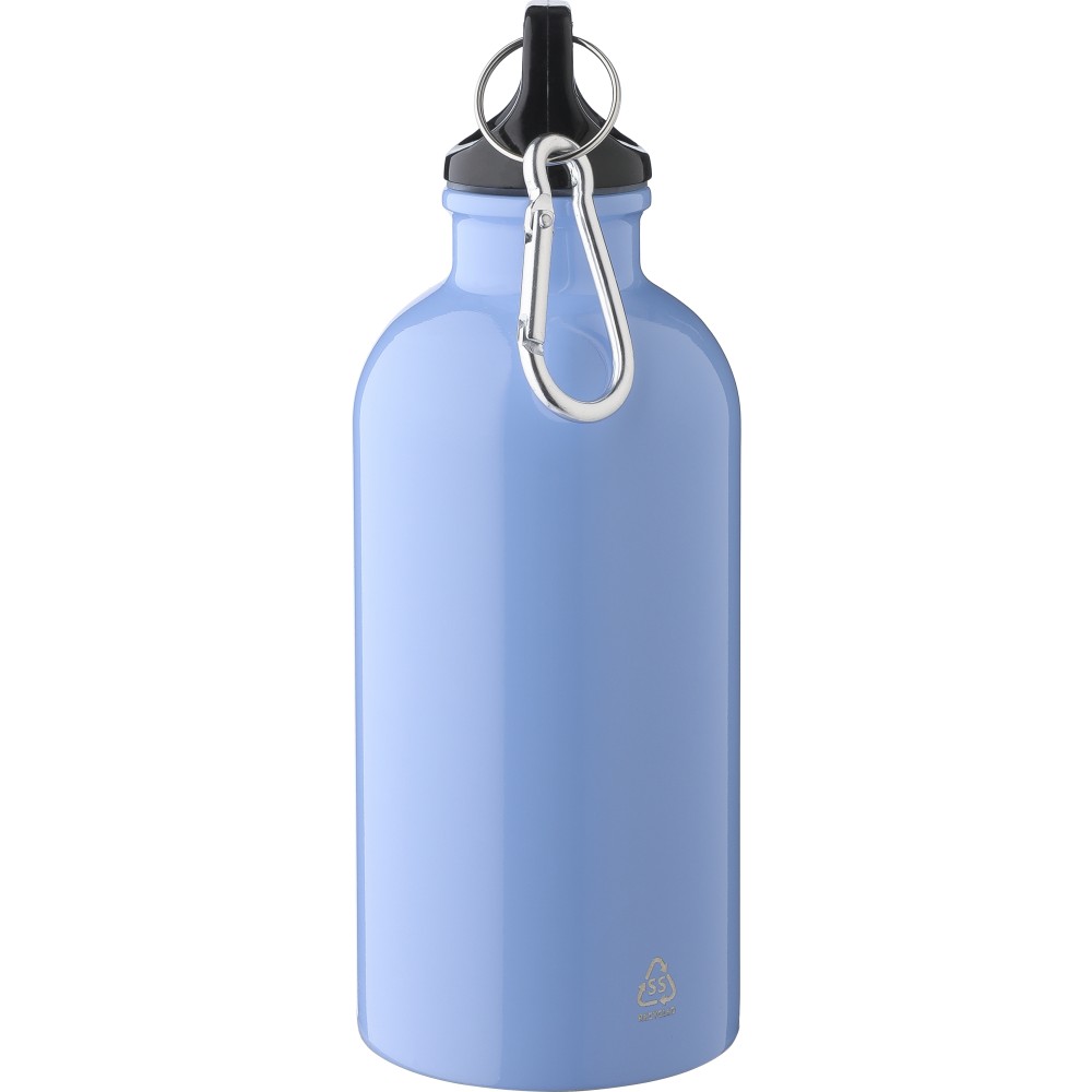Újrahasznosított rozsdamentes acélból készült 400 ml-es szimplafalú kulacs PP kupakkal és alumínium karabinerrel. Az újrahasznosított anyagra utaló logó a palackra van gravírozva. Mosogatógépben nem tisztítható. Emblémázás: Bögredekor, Gravírozás
