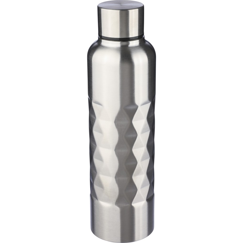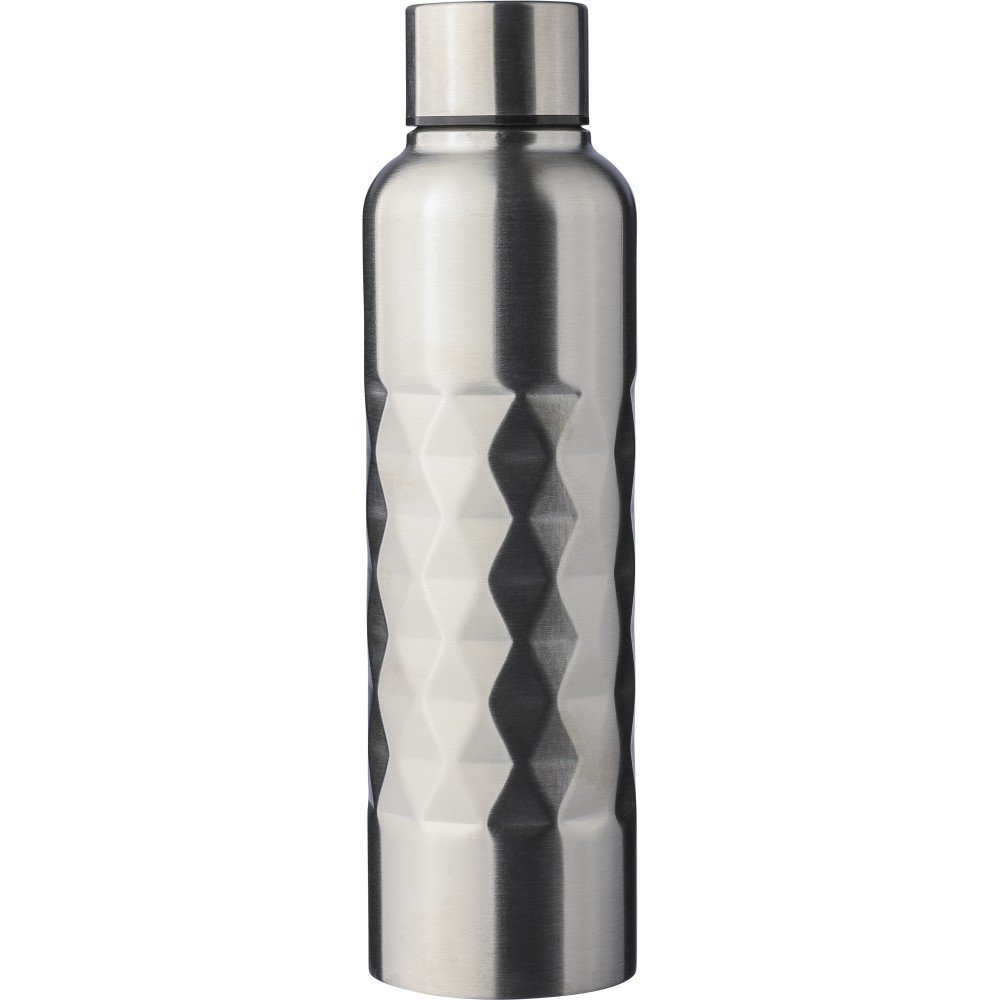 Újrahasznosított 304-es rozsdamentes acélból készült szimplafalú kulacs, 800 ml-es. Gyémánt alakú textúrával a testen, csavaros tetővel és lézergravírozott újrahasznosított logóval. Egyenként csomagolva, barna kartondobozban. Emblémázás: Bögredekor, Gravírozás, Körszita