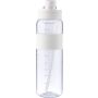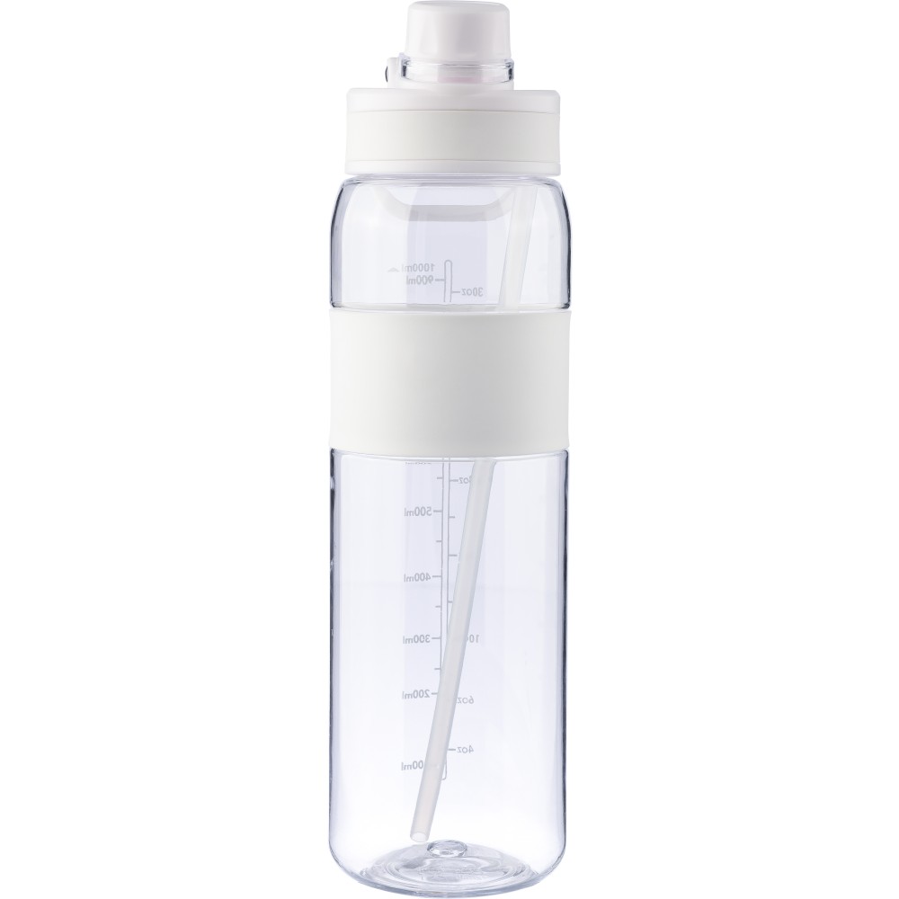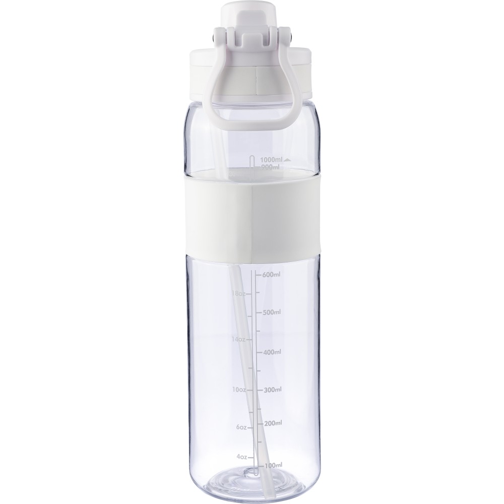 Tritán kulacs, 900 ml-es. Kétféle használati lehetőséggel: csavaros záródású kupak vagy visszahajtható végű szívószál. Szilikon markolattal, PP hordozófüllel és nyomtatott űrtartalom-jelzővel. Emblémázás: Tamponnyomás