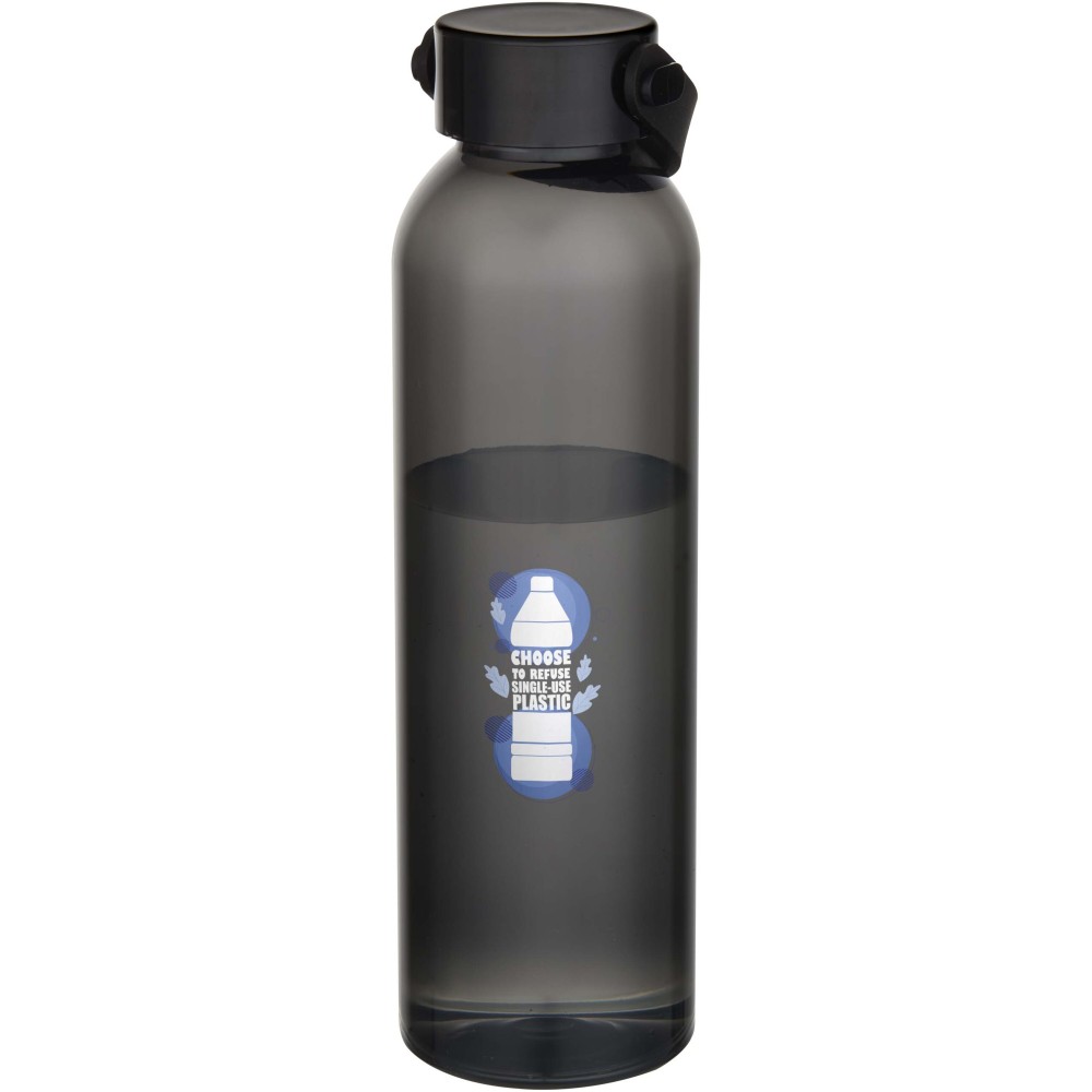 RCS tanúsítvánnyal rendelkező RPET-ből készült kulacs, praktikus szilikon hordozófüllel. Megfelel az EFSA által jóváhagyott PET-újrahasznosítási eljárásnak. Űrtartalom: 630 ml. Emblémázás: Körszita